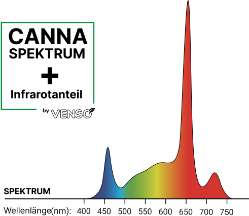 Das Besondere an unserem speziell entwickelten CANNA-Spektrum ist der Infrarotanteil bei 700-760 Nanometern. Die Wellenlängen des Infrarotbereichs stimulieren besonders die Blühphase von Cannabis Pflanzen.
